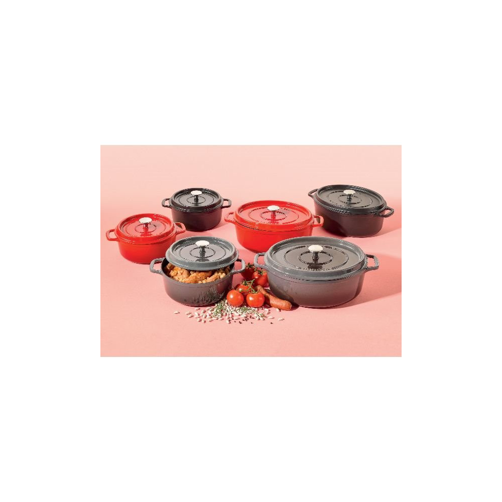 La fonte émaillée noire de cette cocotte de 20 cm de diamètre garantit une diffusion et une rétention de chaleur incomparables : la température monte progressivement, se stabilise et se maintient longtemps, même feu éteint. L'émail protège la fonte de l'humidité, facilite le nettoyage et préserve les saveurs des préparations sans aucune interaction avec les aliments.