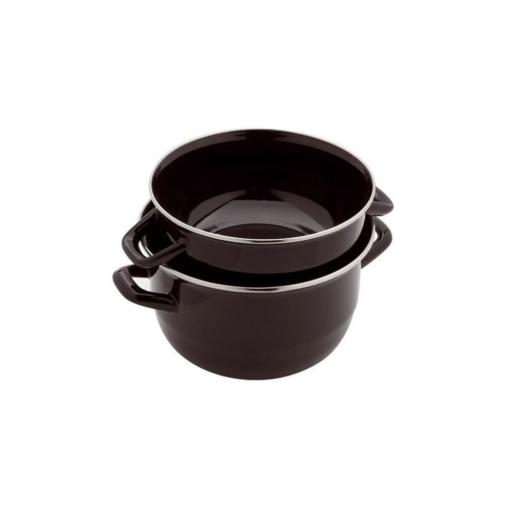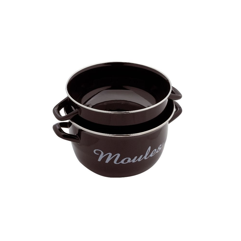 Existe en plusieurs tailles Marmite à moules 18 cm Noire - C'est l'authentique marmite à moules des restaurants de fruits de mer - Son couvercle à poignées, ajusté au corps de la marmite, vous permet de secouer vos moules durant la cuisson - Une fois retourné, il fait office de réceptacle pour les coquilles vides - Noire avec une inscription blanche, elle passera de votre cuisine à votre table - En acier émaillé - Capacité 2.5 L - Pour 1 personne - Compatible tous feux dont induction.