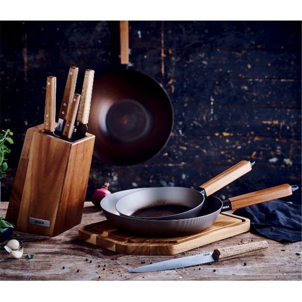 Parfaite pour des œufs, une escalope ou une belle poêlée de légumes, cette poêle 24 cm s'adapte à tous les feux. Pour entretenir le manche en acacia, un léger huilage ponctuel avec une huile alimentaire neutre suffira à le maintenir en parfait état.