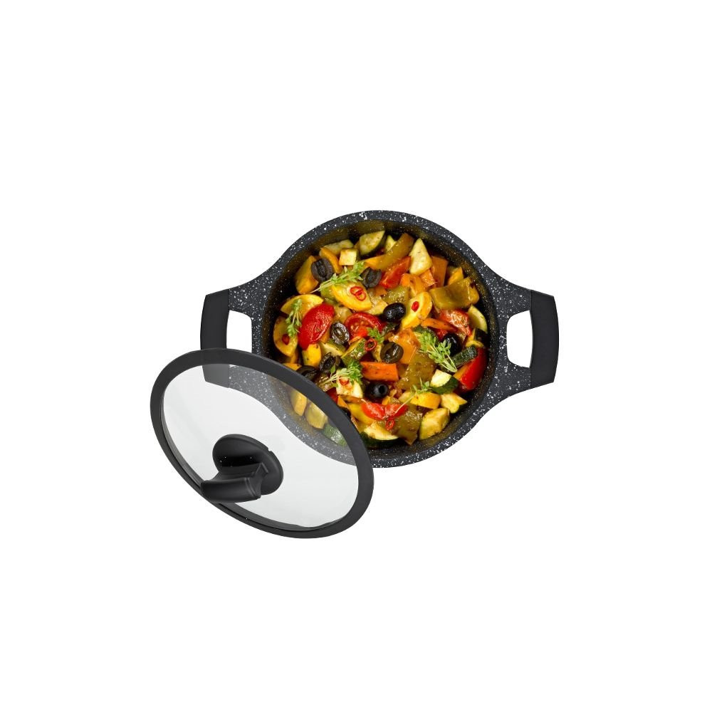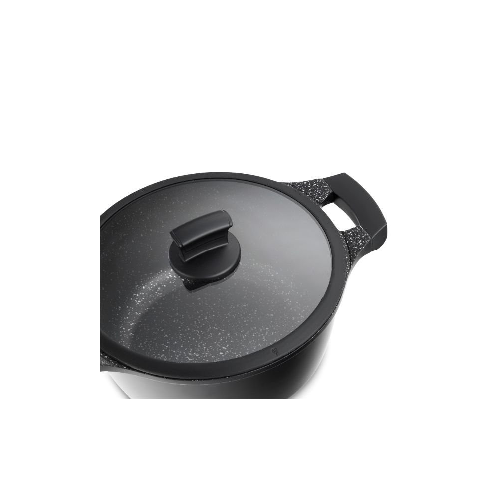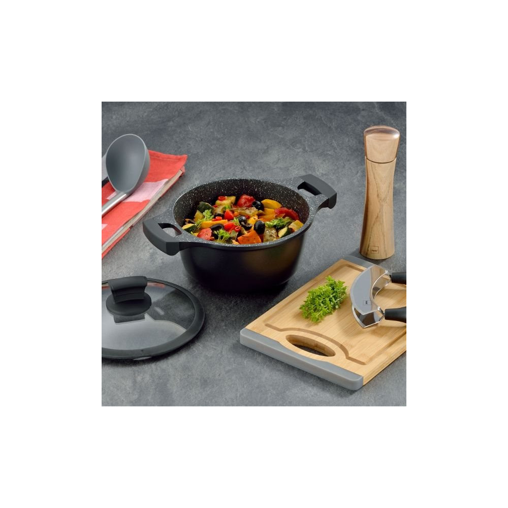 Réalisé en fonte d'aluminium, ce faitout profite d'une excellente conductivité thermique qui permet une montée en température rapide et une diffusion homogène de la chaleur sur toutes les parois. Son revêtement anti-adhésif renforcé 3 couches résistant aux rayures facilite la cuisson sans excès de matière grasse et simplifie considérablement le nettoyage après utilisation.