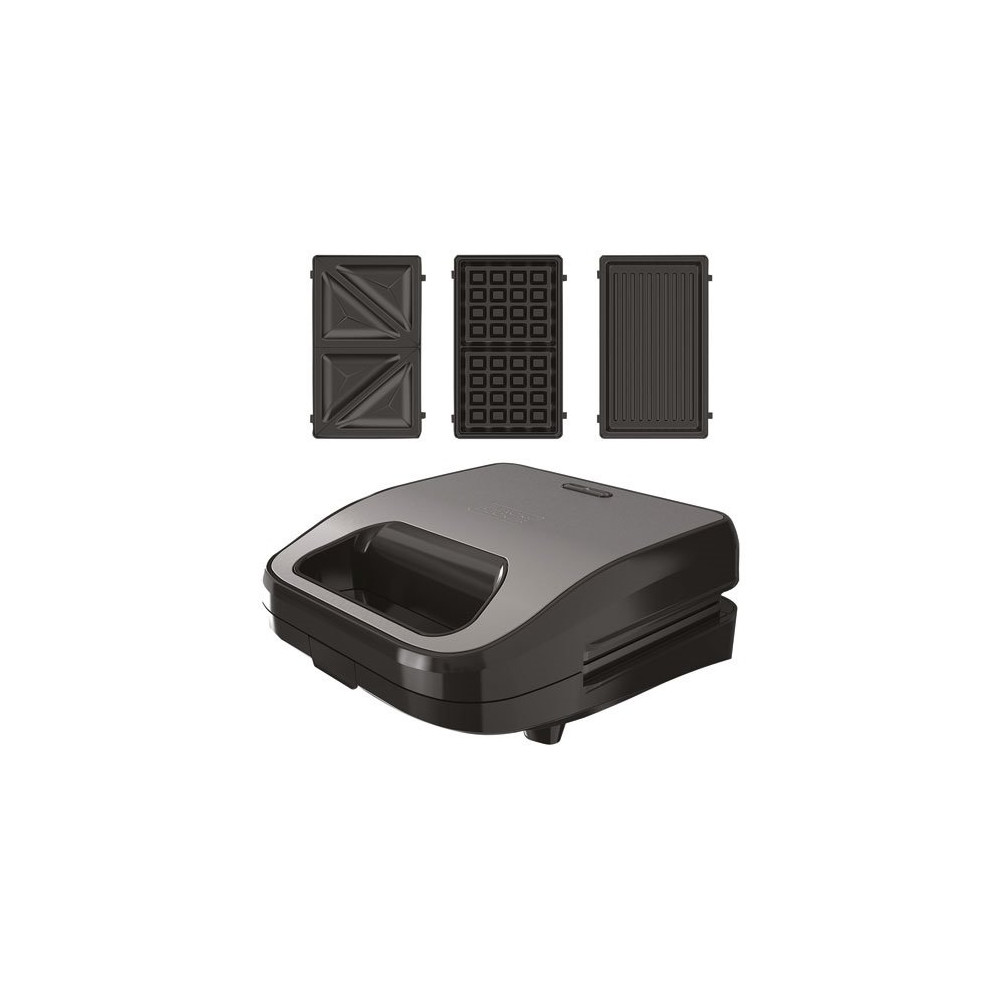 Appareil Croque / Gaufre / Gril - Plaques amovibles 22.5 x 12.5 cm avec un revêtement antiadhésif pour un nettoyage facile - 3 jeux de plaques pour gaufres, croques et grillades - Voyant de fonctionnement « prêt à cuire » pour débuter la cuisson au bon moment - Finition en acier inoxydable anti-traces - Isolation de la poignée et du corps de l’appareil pour une utilisation en toute sécurité - Pieds antidérapants - Range-cordon - Rangement vertical - Coloris Inox & Noir - Puissance 750 W - Garant