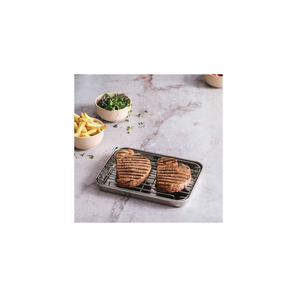 Grâce à sa profondeur de 2,5 cm, ce plat retient parfaitement les jus de cuisson, évitant les éclaboussures dans le four tout en permettant de récupérer un fond de sauce savoureux. La grille amovible se révèle précieuse pour rôtir des volailles ou des pièces de bœuf en assurant une circulation de l'air sous les aliments, pour refroidir des viennoiseries à la sortie du four, ou encore pour glacer des entremets avec précision sans tacher le plan de travail.