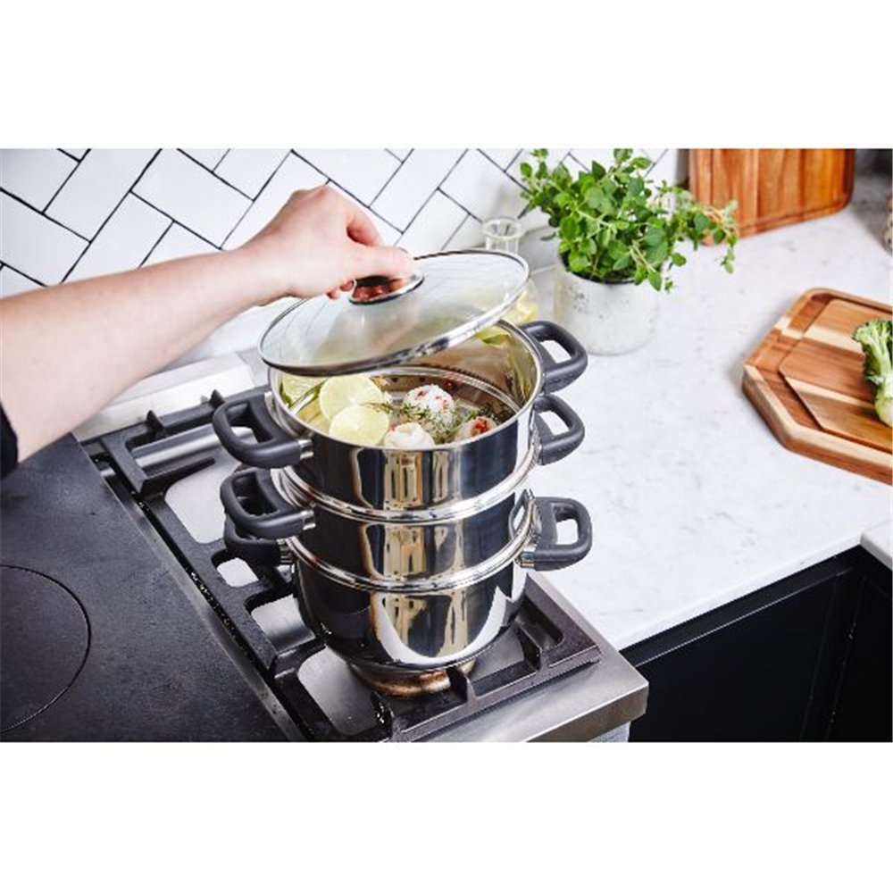 Conseil d'utilisation : Pour une cuisson homogène, ne superposez pas trop les aliments dans le panier vapeur et veillez à maintenir un niveau d'eau suffisant dans la casserole de base. Ajoutez des herbes aromatiques dans l'eau pour parfumer délicatement vos préparations.