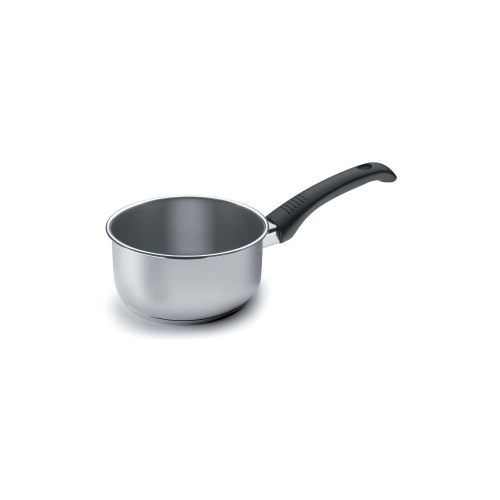 Existe en plusieurs tailles Casserole 12 cm - Studio - En inox 18/10 - Poignée ergonomique en bakélite noire - Triple fond - Embase anti-flamme - Tous feux dont induction.