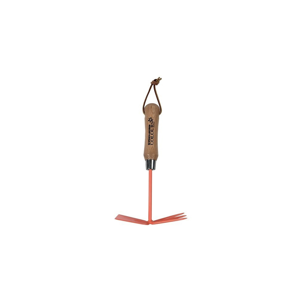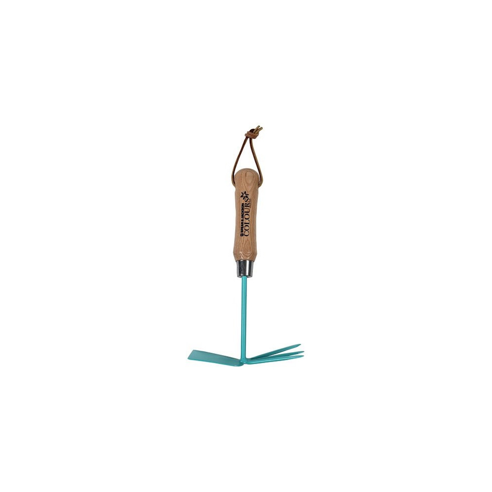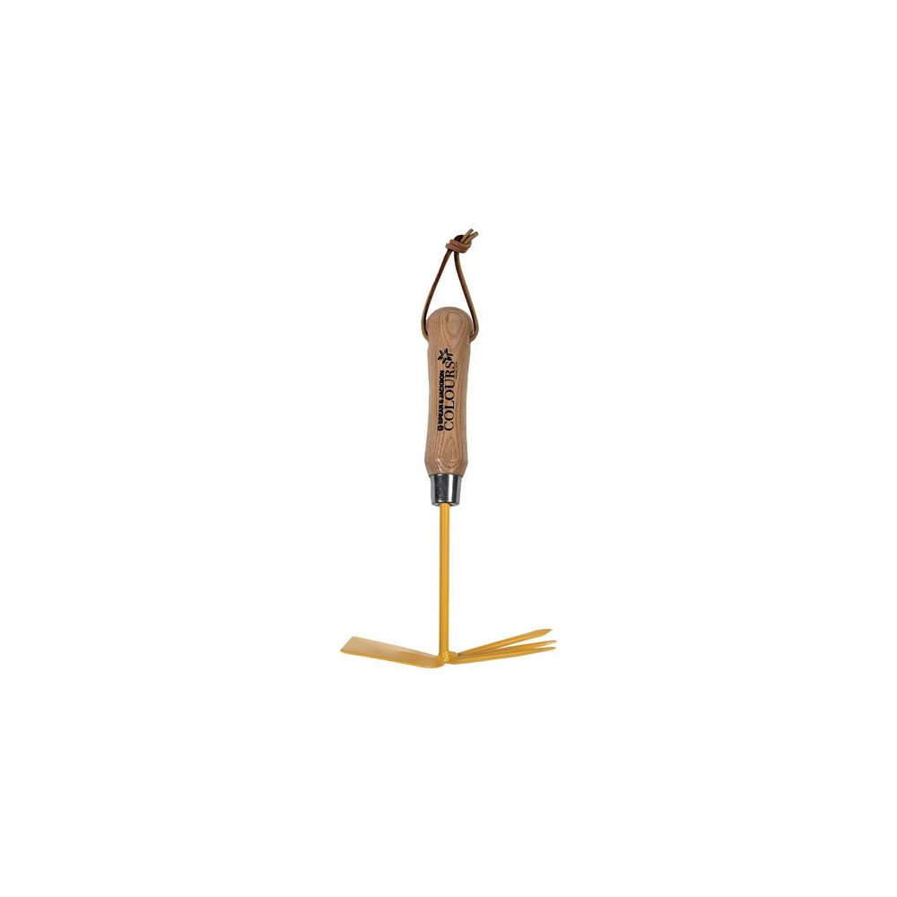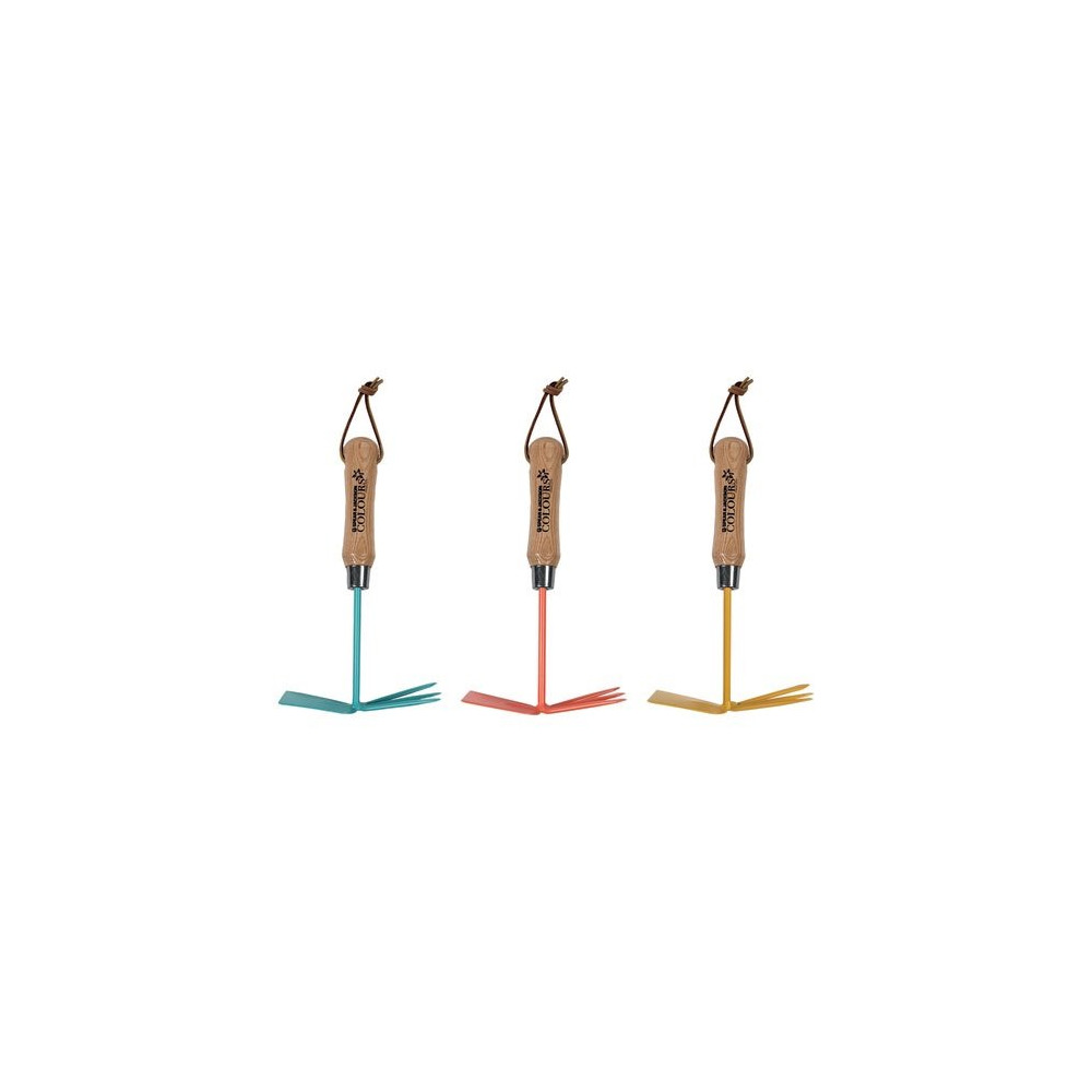 Dim.32x5x18cm. Tête en acier et manche en frêne. Existe en trois coloris, bleu, orange et jaune. Coloris livrés aléatoires, pas de possibilité de choisir le coloris.Spécialement utilisée pour biner et alléger la terre dans les massifs.