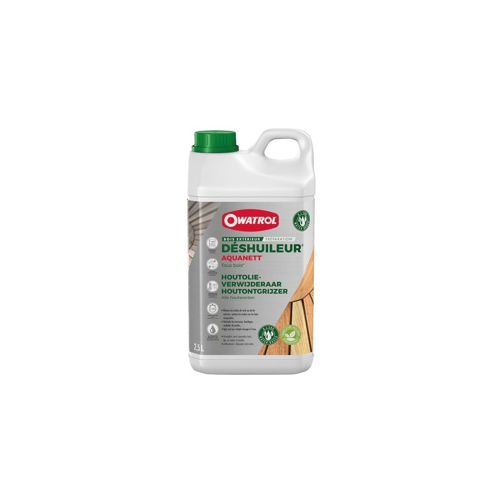 Aquanett Owatrol en format 2,5 L est un produit spécialement conçu pour préparer efficacement les surfaces en bois avant toute application de finition. Ce déshuileur et dégriseur à l'eau élimine les huiles, les graisses, les dépôts de pollution et les traces de grisaillement qui s'accumulent sur le bois exposé aux intempéries, lui restituant un aspect propre et homogène.