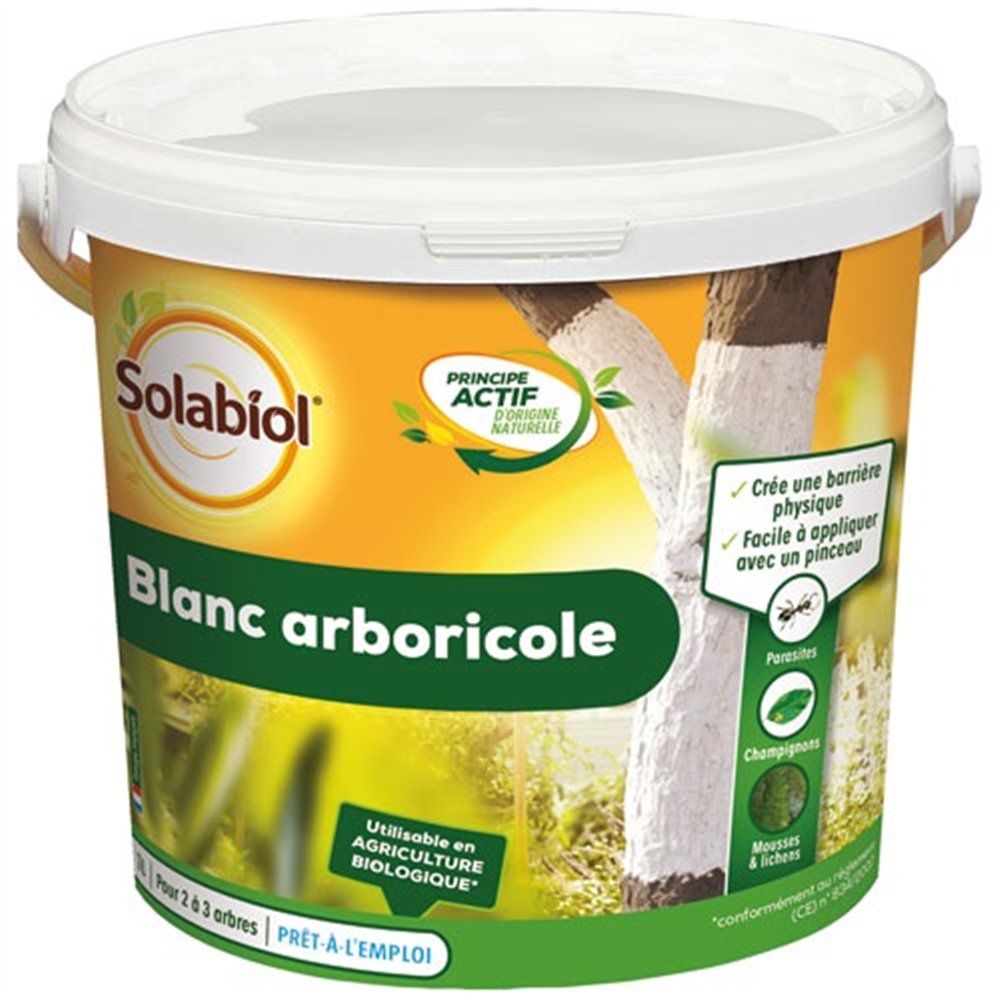 Le blanc arboricole Solabiol en seau de 1 litre est un enduit de protection traditionnel utilisé pour badigeonner le bas des troncs d'arbres. Sa couleur blanche caractéristique n'est pas qu'esthétique : elle joue un rôle actif de réflexion des rayons solaires et de protection contre les chocs thermiques hivernaux qui peuvent fissurer l'écorce.