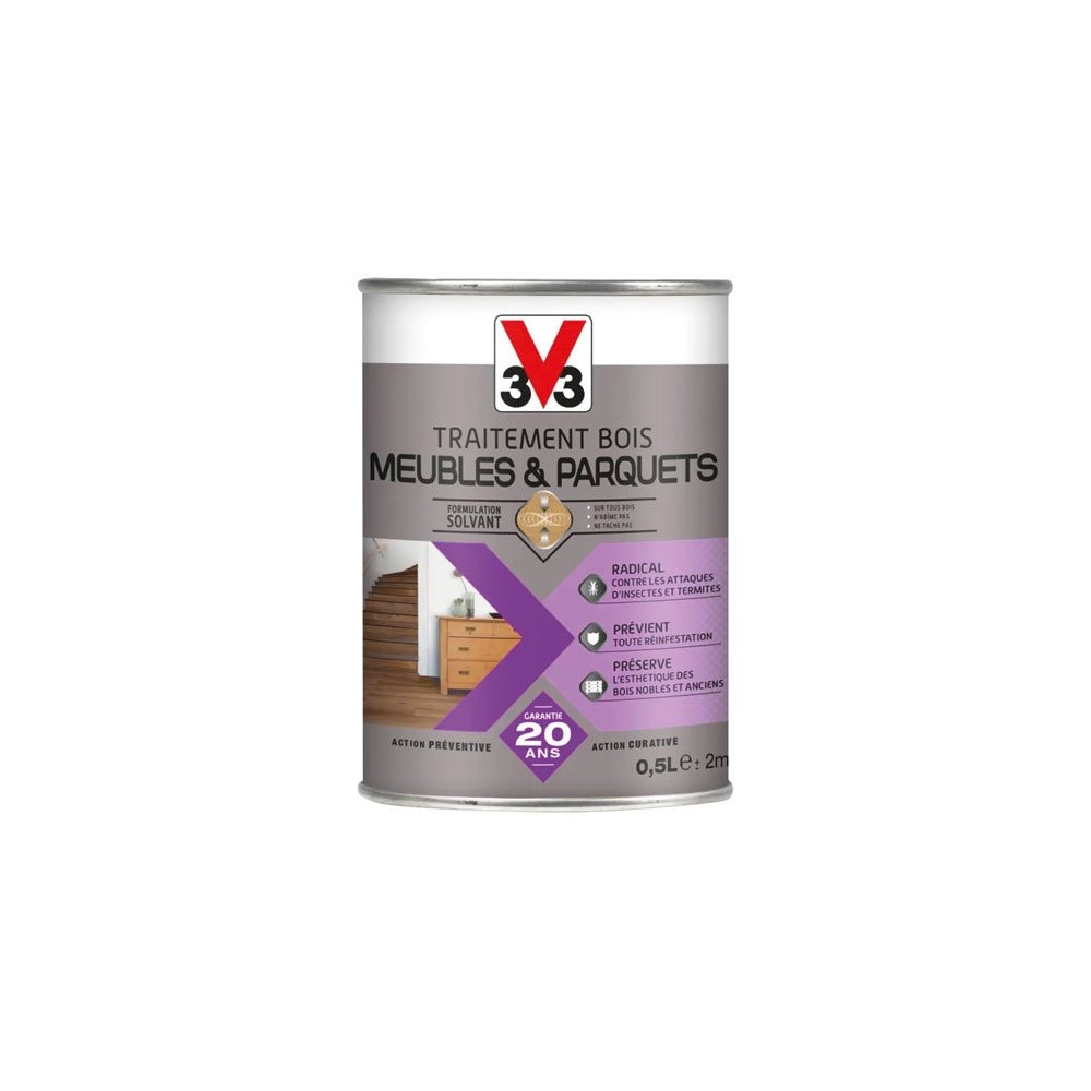 Préserver le bois intérieur de votre maison des dégradations biologiques, c'est avant tout agir tôt et régulièrement avec le bon produit. Le Traitement meubles et parquets V33 en format 0,5 l est une référence éprouvée pour protéger durablement toutes les menuiseries intérieures, aussi bien en prévention qu'en traitement curatif d'une infestation déjà présente.