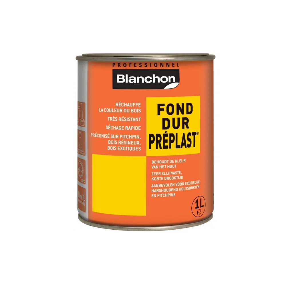 Primaire universel de haute qualité, idéal en première couche avant vitrification, vernissage, mise en cire ou peinture des boiseries intérieures. | Grâce à ses résines spécifiques, Fond Dur Préplast offre une grande dureté, un excellent polissage et est compatible avec la plupart des finitions Blanchon. | | Son séchage rapide en 45 minutes permet un égrenage immédiat, réduisant ainsi le temps de travail. | Il optimise l'accrochage des vitrificateurs, même sur bois exotiques ou parquets ayant été cirés, encaustiqués ou huilés. | De plus, il relève peu les pores du bois et rehausse sa couleur naturelle pour un rendu chaleureux et impeccable.