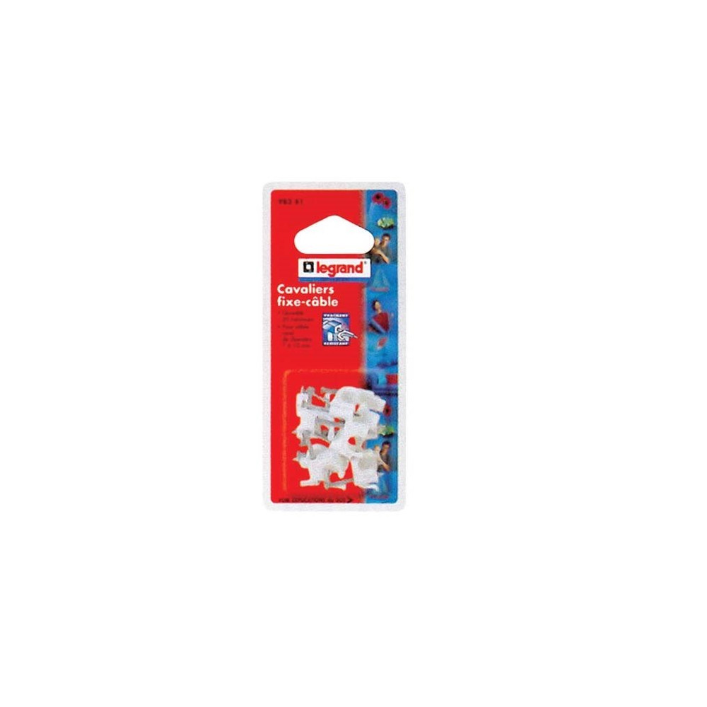 Ce cavalier de la marque Legrand est taillé pour les câbles d'un diamètre de 7 mm, correspondant typiquement aux câbles d'alimentation fins, câbles de sonnette ou câbles de communication. Sa structure rigide en plastique technique assure une tenue dans le temps, sans fragilisation ni déformation, même exposé à des variations de température légères. La fixation s'effectue simplement par clouage ou vissage selon le support.