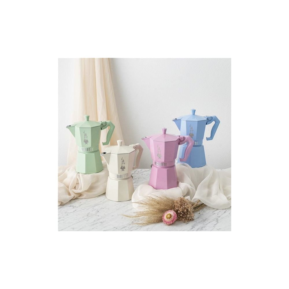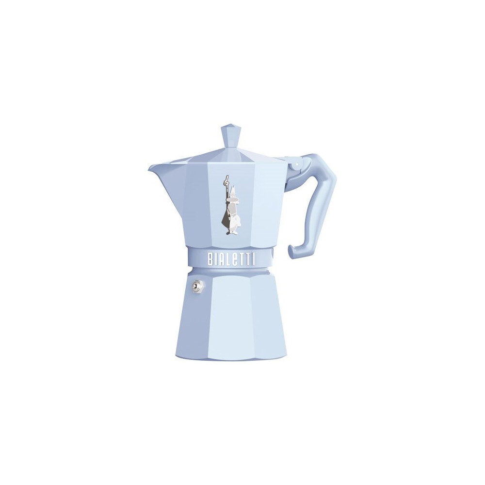 Fidèle à l'ADN Bialetti, cette Moka repose sur un principe de percolation par pression de vapeur qui extrait tous les arômes du café pour un résultat dense et savoureux. Sa robe bleu pastel distinctive habille un corps robuste conçu pour durer, avec une finition soignée qui fait de cette cafetière un objet aussi décoratif que fonctionnel.