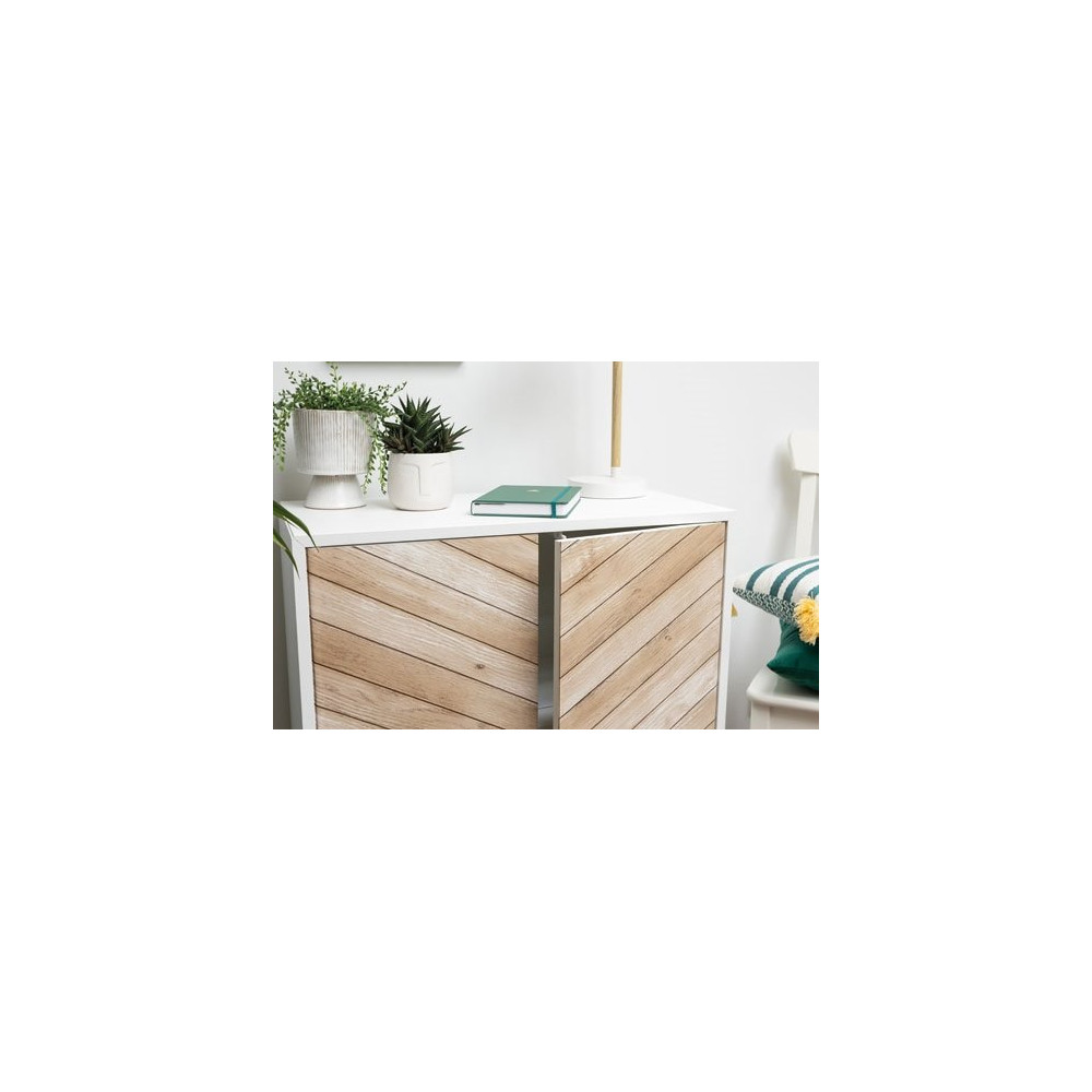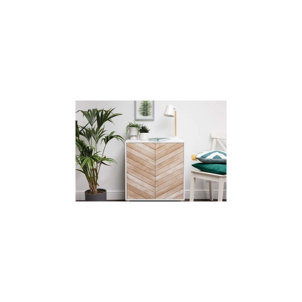 Décor imitation bois clair pose chevron. | Cet adhésif habille facilement les petits mobiliers, murs ou tout autre support lisse. | Peut être immédiatement décollé pour être repositionné.