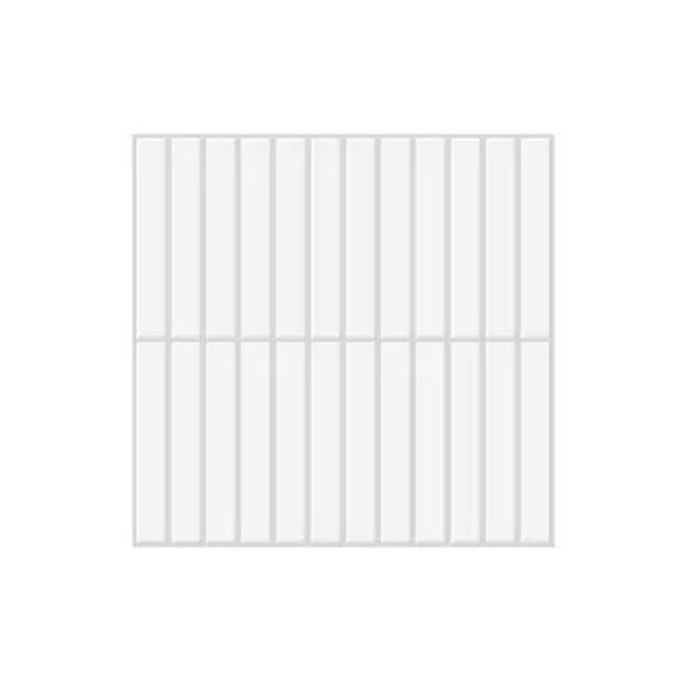 La géométrie stricte des lignes génère un effet visuel fort et tridimensionnel qui dynamise instantanément n'importe quelle surface murale. Ce carrelage adhésif colle directement sur les supports lisses et propres — carrelage ancien, peinture, verre ou stratifié — sans colle, sans visserie et sans aucun outil particulier. Le rendu blanc lumineux agrandit visuellement les petits espaces et s'adapte à toutes les palettes de couleurs.