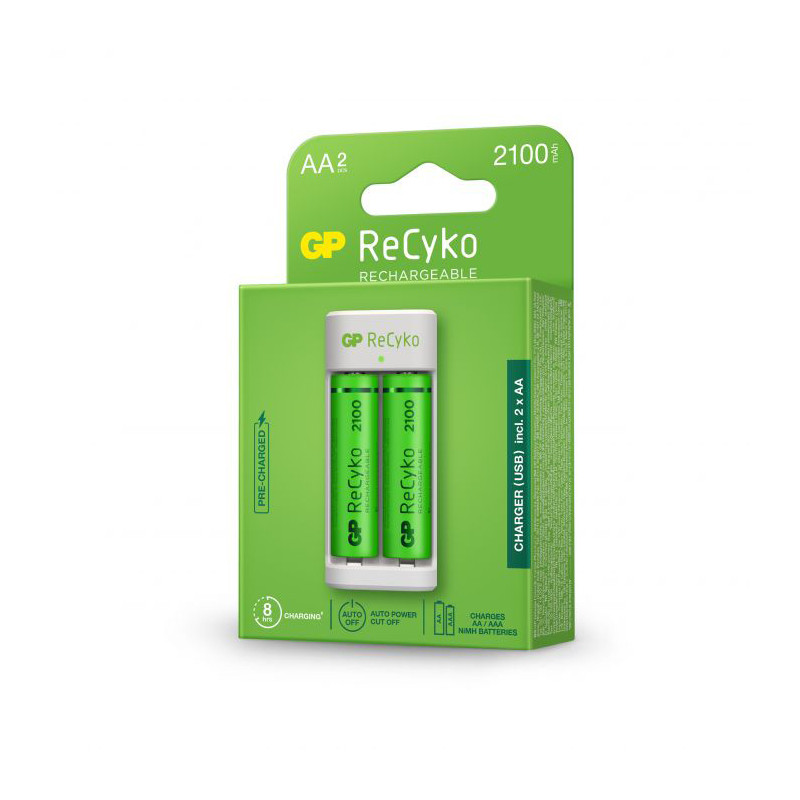Le chargeur USB GP ReCyko E211 offre une solution pratique, fiable et sécurisée pour le chargement des batteries à domicile, au bureau, voire en déplacement. | Compact et léger, ce chargeur de batterie USB dispose de deux emplacements de chargement. Il est accompagné de deux piles AA GP ReCyko d'une capacité de 2100mAh, offrant une solution complète pour répondre à divers besoins d'alimentation. | Grâce à des caractéristiques techniques avancées et à un système de sécurité intelligent, le GP ReCyko E211 assure un processus de chargement efficace et sûr pour vos batteries, garantissant une utilisation fiable en toutes circonstances.