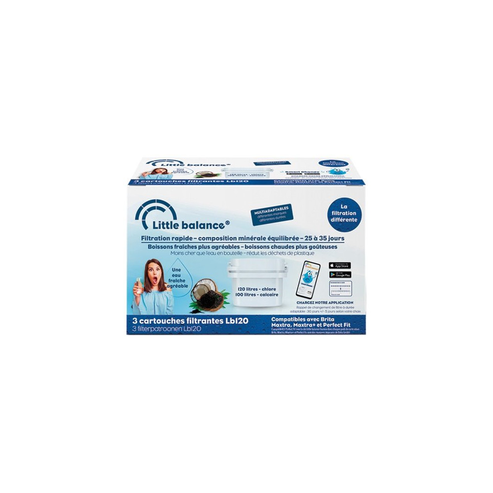 Profitez d'une eau filtrée de qualité en permanence grâce au pack de 3 cartouches filtrantes Little Balance, conçu pour remplacer facilement la cartouche de votre carafe filtrante. Avec ce pack économique, vous disposez d'une autonomie de filtration de 75 à 105 jours (3 x 25-35 jours), pour une eau toujours fraîche, pure et agréable à boire ou à utiliser en cuisine.