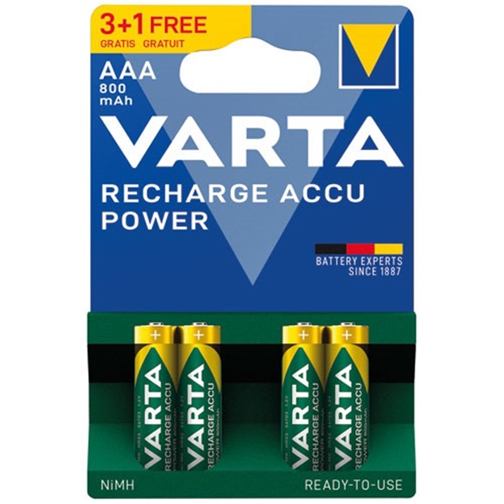 Dites adieu aux piles jetables avec les piles rechargeables VARTA Recharge Accu Power HR03 AAA 800 mAh, proposées en format avantageux blister 3+1 offerte. Reconnaissables à leur coloris vert caractéristique, ces accumulateurs NiMH sont livrés prêts à l'emploi (ready to use), ce qui signifie qu'ils sortent du packaging avec une charge suffisante pour une utilisation immédiate — aucune charge préalable requise.