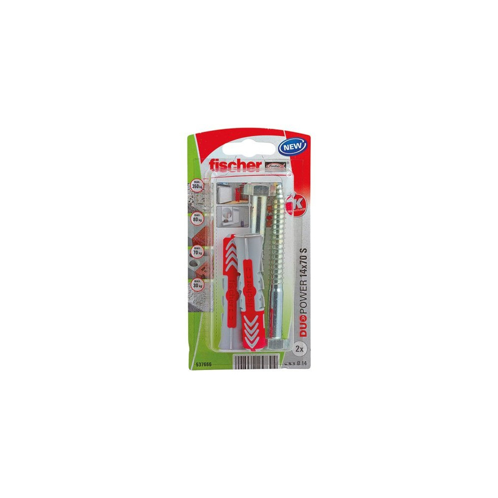 La cheville DuoPower 14 x 70 S avec vis lot de 2 de chez Fischer Fixation est une association de deux matières pour davantage de performances. Fonctionnement sûr pour les matériaux pleins (expansion) et de construction creux et en panneaux (se déploie/noeud). Installation facile : la collerette étroite empêche la cheville de glisser dans le perçage. Excellent feedback de la cheville - on sent précisément quand elle est correctement posée. Avec la vis adaptée pour une tenue parfaite. La cheville
