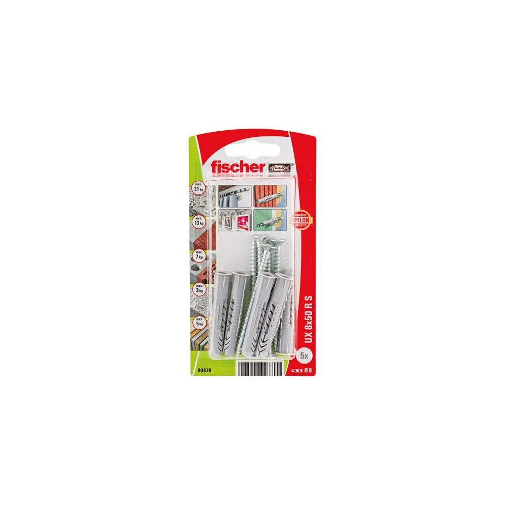 Polyvalente et fiable, la cheville universelle Fischer UX 8x50 RS est vendue en blister de 5 pièces avec vis incluses, prête à l'emploi pour tous vos travaux de fixation murale. Conçue en nylon haute résistance, elle s'impose comme la cheville de référence pour intervenir sur l'ensemble des matériaux de construction courants sans se soucier de la nature du support.