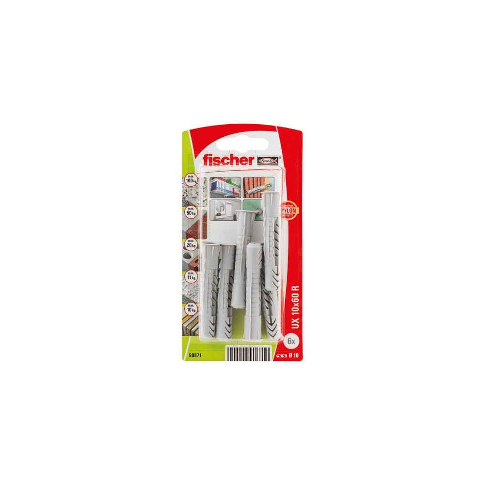 Avec son blister de 6 chevilles universelles Fischer UX 10x60 R, vous disposez d'un stock idéal pour vos fixations lourdes sur l'ensemble des matériaux de construction. Cette cheville nylon grand format, issue de la gamme UX reconnue de Fischer, garantit un ancrage robuste et homogène aussi bien dans le béton plein que dans les matériaux plus poreux comme le béton cellulaire ou la brique creuse.