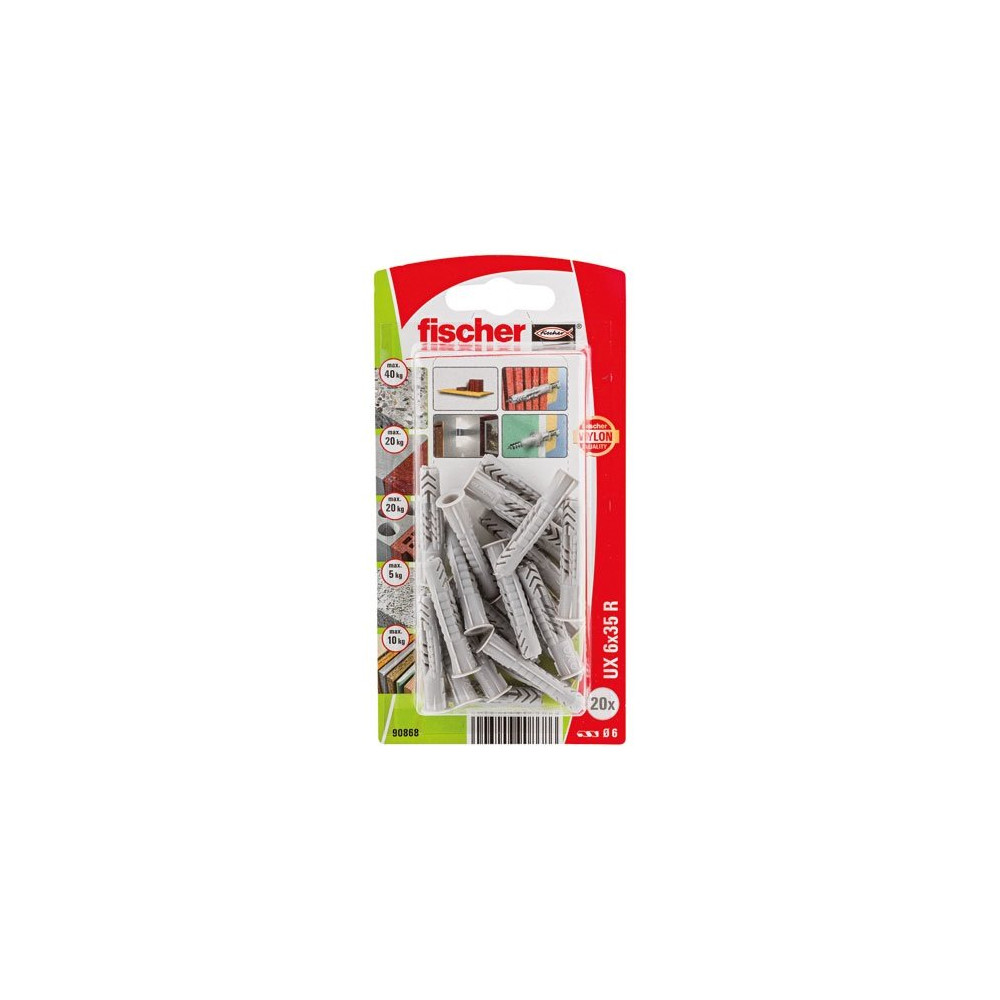 Pratique et économique, le blister de 20 chevilles universelles Fischer UX 6x35 R est la référence incontournable pour toutes les fixations légères sur matériaux de construction. Ce format court 6x35 mm est spécifiquement adapté aux murs avec des contraintes d'enfoncement réduites, notamment lorsqu'une gaine, un ferraillage ou un isolant se trouve à faible profondeur dans la paroi.