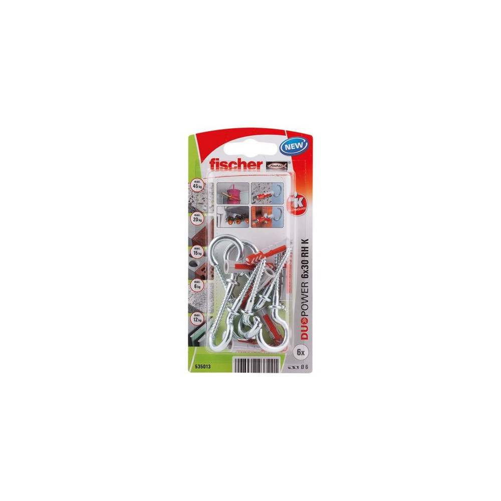 La cheville en nylon bi-matière de 6 mm de diamètre pour 30 mm de longueur convient aux charges légères à moyennes. Sa technologie duopower lui permet de s'adapter automatiquement au matériau percé : béton, brique pleine, parpaing, béton cellulaire ou matériaux creux. Le crochet rond métallique est solide et traité contre la corrosion pour une durabilité en intérieur comme en extérieur abrité.