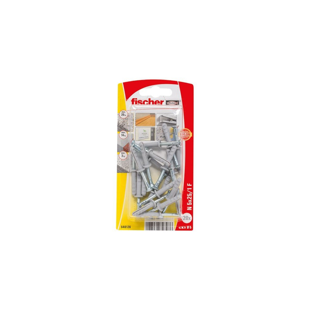 Le format 5x25/1 F indique un diamètre de 5 mm pour une longueur de 25 mm, avec un clou de fixation inclus. Cette cheville nylon à expansion frontale est parfaitement adaptée aux charges légères et aux installations nécessitant un gain de temps significatif. Le blister de 20 unités est économique et pratique pour les chantiers ou les travaux en série.