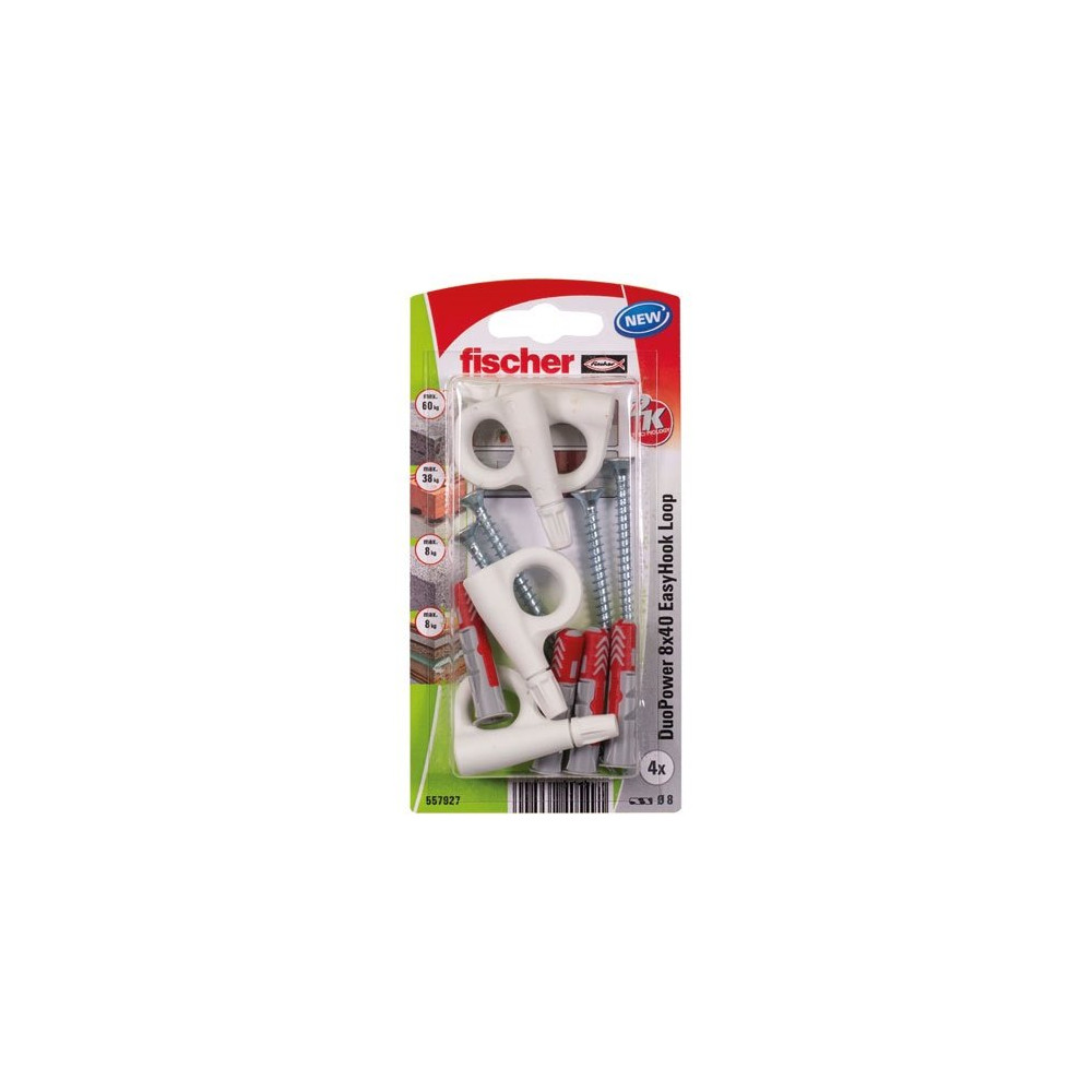 Pour les fixations sur câble ou fil nécessitant un ancrage robuste, le Fischer Duopower 8x40 EasyHook piton est la référence à privilégier. Ce kit combine un piton à anneau fermé (illet) de grande taille avec la cheville tous matériaux Duopower 8x40 mm, le format haute résistance de Fischer, pour créer des points d'accrochage stables capables de supporter des charges significatives.