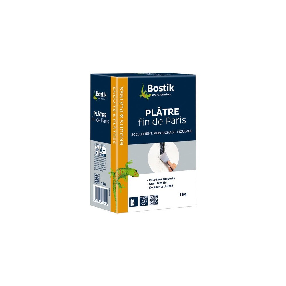 Le plâtre fin de Paris de 1 Kg de la marque Bostik permet de sceller, de reboucher de grosses cavités et de réaliser des moulages. Idéal pour les supports en intérieur de type plâtre, plaques de plâtre cartonnées, mortier, béton, béton cellulaire, parpaing, ciment et brique. Ne pas recouvrir de produit à base de ciment ou de béton. Le support doit être dur, sain, propre, sec, non poussiéreux, exempt de graisse et de zones non adhérentes. Le plâtre n'adhère pas sur des supports lisses (poncer, br