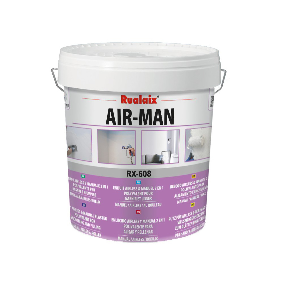 L'enduit RUALAIX AIR-MAN RX608 en sac de 25 kg redéfinit la polyvalence en matière d'enduits de finition intérieure. Véritable produit 2 en 1, il combine dans une seule référence les fonctions de garnissage et de lissage, et s'applique indifféremment à la machine airless, manuellement à la lisseusse ou au rouleau. Fini les changements de produit entre les phases de préparation et de finition !