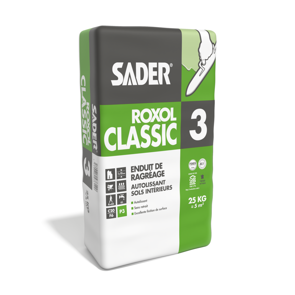 Avant mise en œuvre, préparez le support (propre, sain, dépoussiéré) et appliquez si nécessaire un primaire d'accrochage adapté. Respectez scrupuleusement le dosage en eau recommandé pour obtenir un coulage fluide et une surface parfaitement plane après séchage. Le ROXOL Classic 3 en 25 kg est disponible chez Brikoleur, accompagné de toute la gamme des produits de préparation de sol.