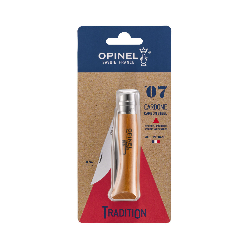 L'acier carbone est le matériau historique des couteaux Opinel. S'il demande un entretien légèrement plus attentif que l'inoxydable, il récompense son utilisateur par une facilité d'affûtage inégalée et une acuité de coupe particulièrement adaptée aux travaux précis de bricolage, découpe de matériaux souples, travail du bois ou jardinage. C'est aussi le couteau idéal pour initier à l'entretien et à l'affûtage des lames.
