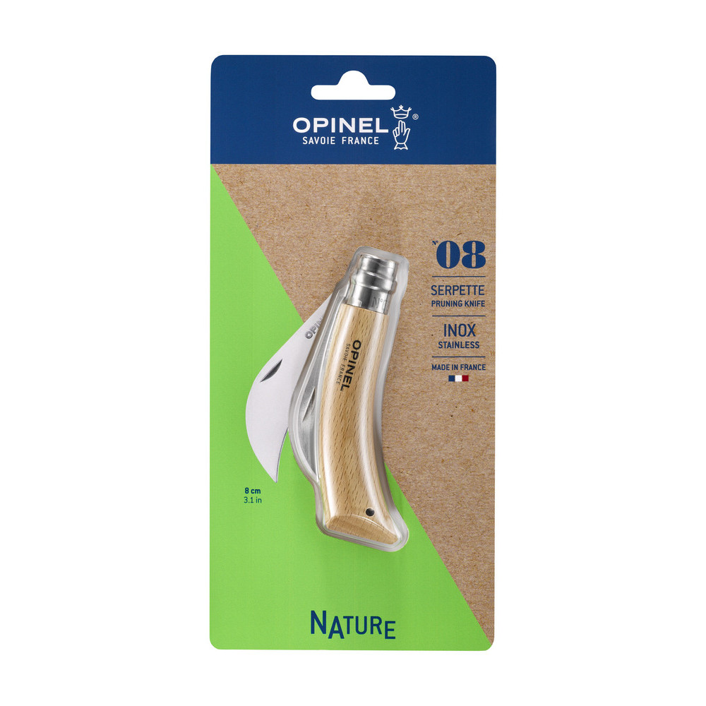Sa lame en acier inoxydable de 8 cm présente une légère courbe caractéristique des serpettes de qualité, permettant des découpes franches tout en limitant l'effort. Le manche de 8 cm en bois verni offre une prise en main équilibrée et confortable, même lors de longues sessions de taille. Le système de blocage de lame breveté Opinel — la virole tournante — permet de verrouiller la lame en position ouverte ou fermée pour un usage sécurisé et un transport sans risque.