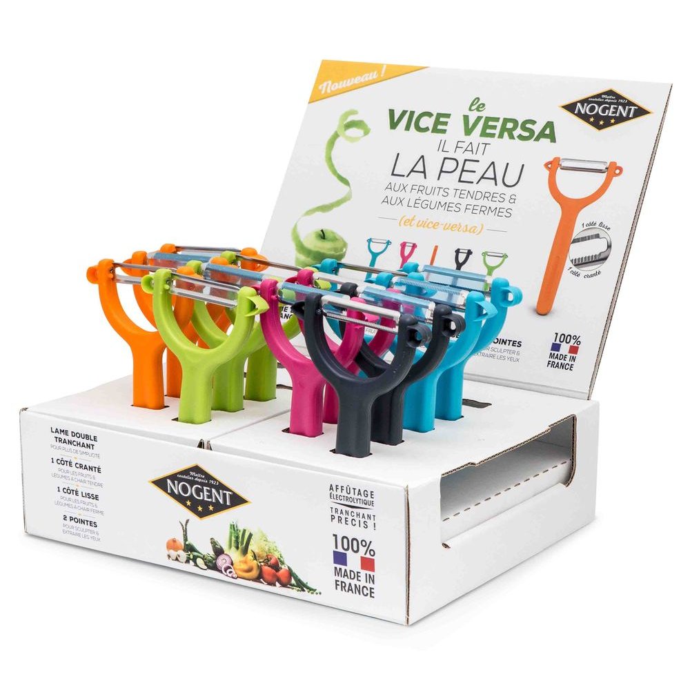 Ce présentoir contient 20 éplucheurs, idéal pour les revendeurs ou pour se constituer un stock durable. La qualité de fabrication Nogent 3 Étoiles, marque française reconnue depuis des décennies, garantit une lame tranchante sur le long terme. Un ustensile à offrir ou à s'offrir pour transformer une corvée quotidienne en geste simple et précis.