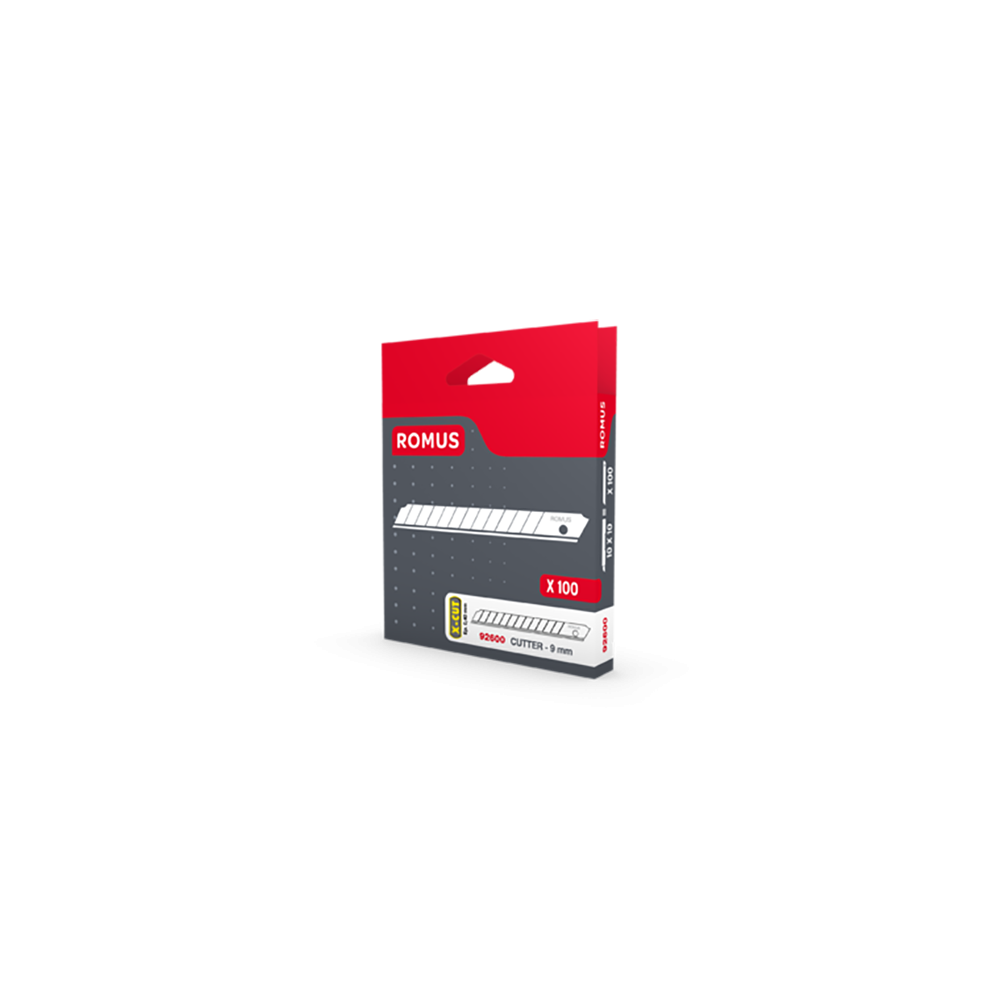 La boîte de 100 lames de cutter X-CUT Acier 9 mm de Romus est la solution économique et performante pour tous les professionnels et artisans consommant régulièrement des lames de rechange. Au format 9 mm, ces lames sont compatibles avec la grande majorité des cutters standards du marché et conviennent à une multitude de travaux de découpe précise.