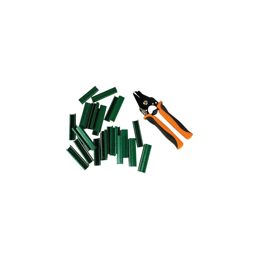 Les agrafes plastifiées vertes ont été choisies pour leur discrétion visuelle dans les espaces naturels et végétaux : leur teinte se fond dans le feuillage et le grillage, rendant les fixations quasi invisibles une fois posées. La plastification assure également une excellente résistance à la corrosion, garantissant une tenue dans le temps même exposées aux intempéries et à l'humidité. L'agrafeuse est compatible avec des agrafes de 16 à 20 mm, offrant une flexibilité selon l'épaisseur du matériau à fixer.