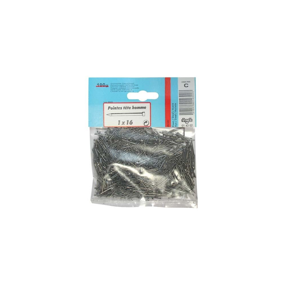 Les pointes Tête Homme acier brut Vynex en sachet de 100 g sont des clous polyvalents destinés aux travaux courants de menuiserie, charpente légère et assemblage de bois. Leur format 1,0 x 20 mm — diamètre 1 mm pour une longueur de 20 mm — en fait des pointes fines et précises, adaptées aux bois tendres, aux moulures, aux baguettes et aux travaux de finition où la discrétion du clouage est essentielle.
