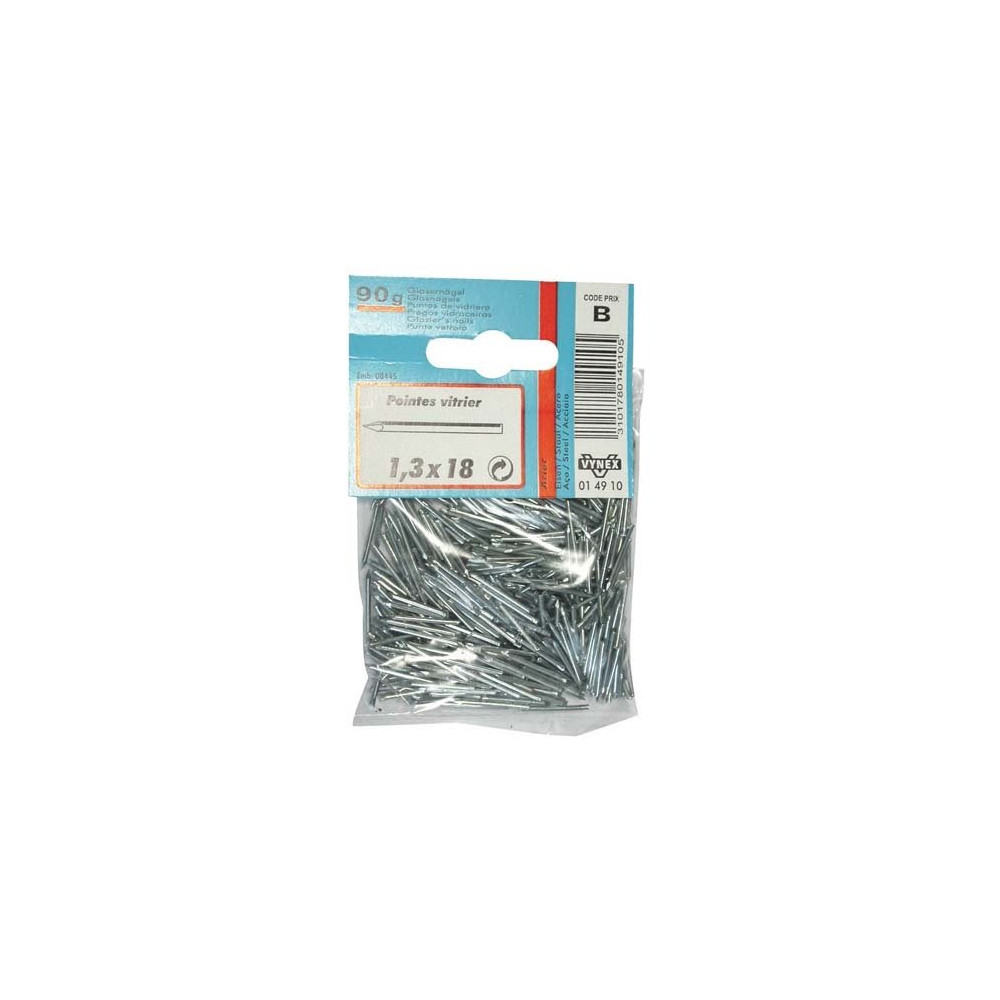Spécialement étudiées pour les travaux de vitrerie et de menuiserie fine, les pointes vitrier VYNEX en acier zingué de 1,3 x 18 mm permettent de maintenir efficacement les vitres dans leur feuillure sans risquer de fissurer le verre. Ce conditionnement 90 g offre une quantité généreuse pour couvrir plusieurs chantiers ou interventions d'entretien.