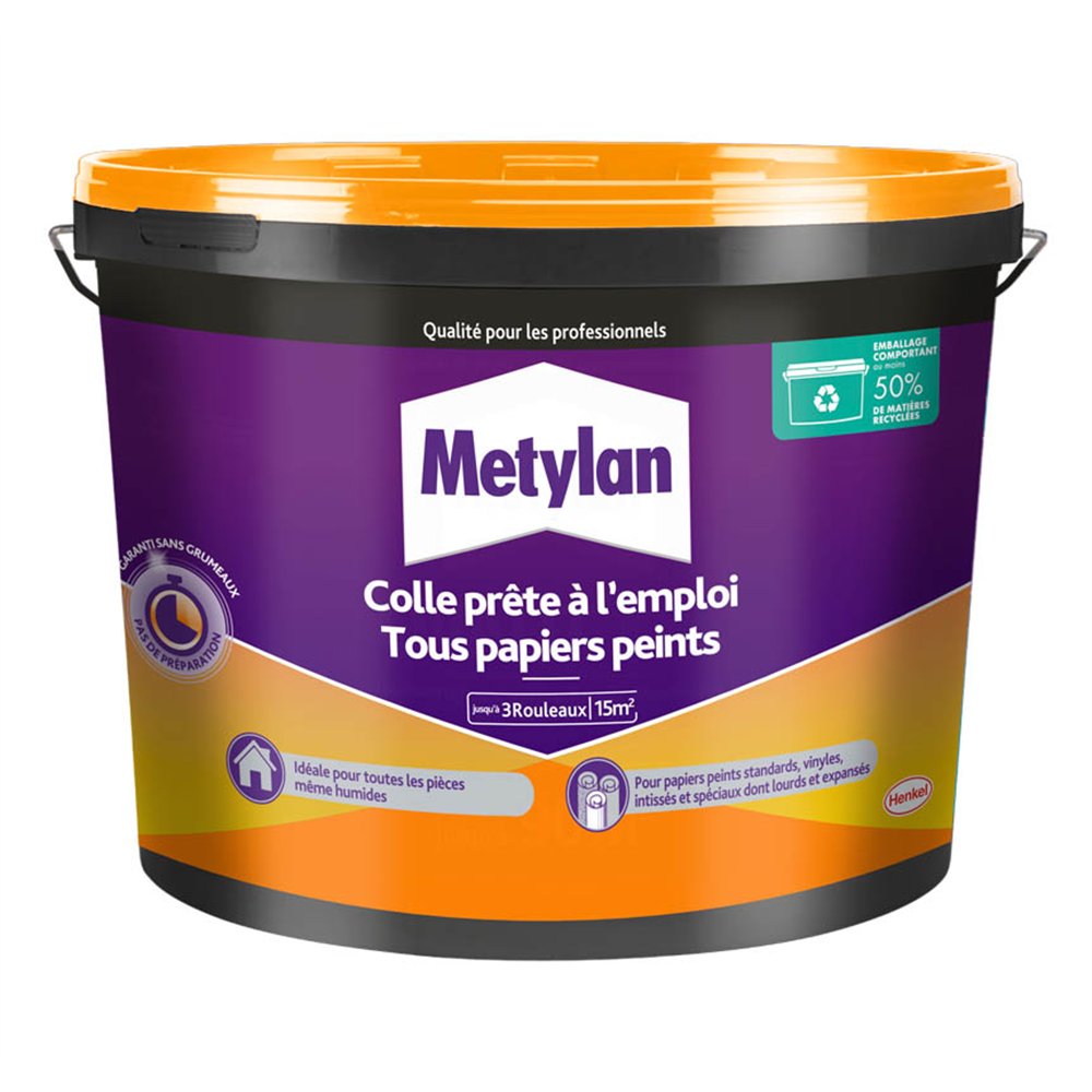 La Colle Tous Papiers Peints Prête à l'Emploi de Metylan est la solution universelle pour tous vos travaux de pose de revêtements muraux. Compatible avec l'ensemble des types de papiers peints — standards, vinyles, intissés et papiers spéciaux — elle s'adresse aussi bien aux particuliers bricoleurs qu'aux professionnels de la décoration intérieure.