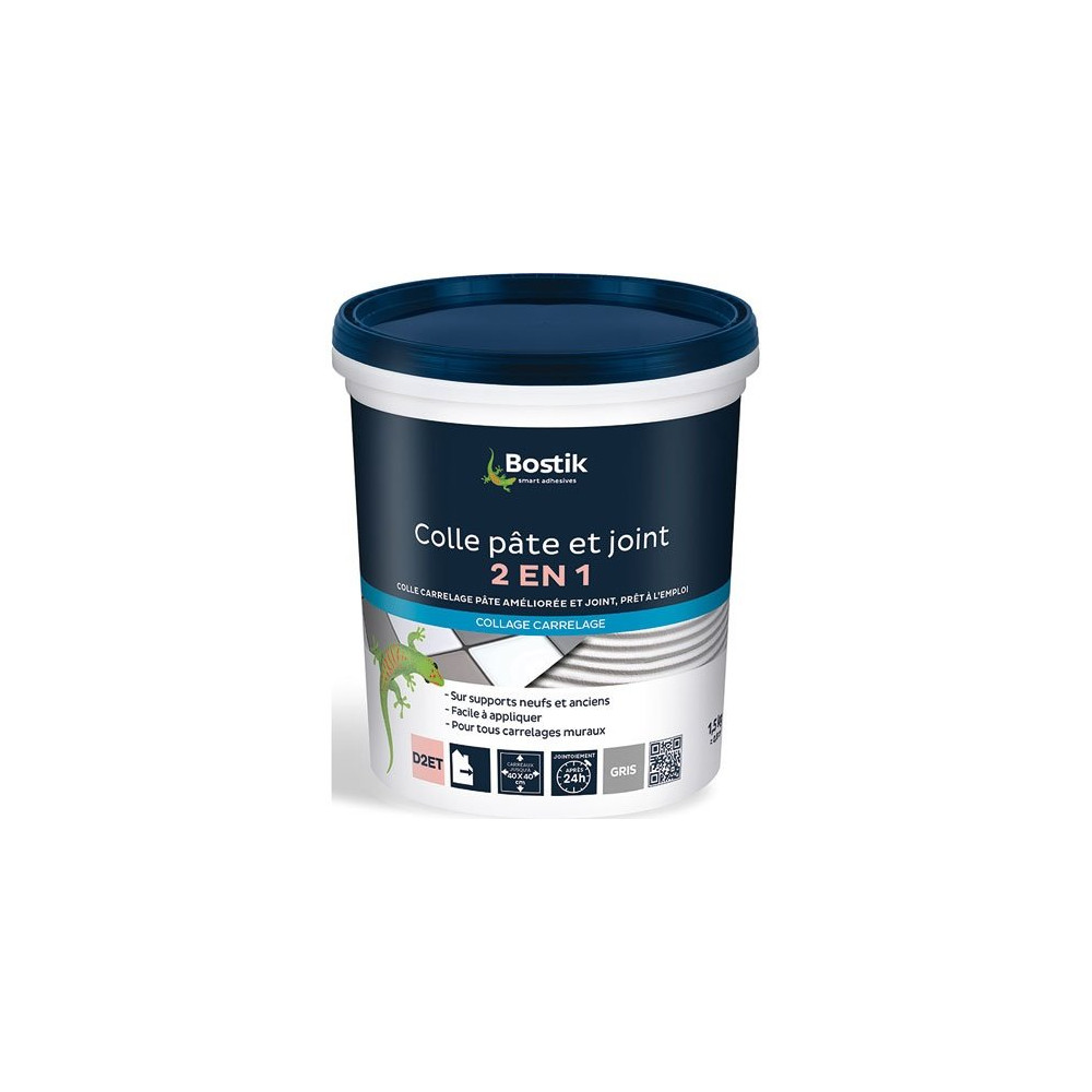 Pratique et polyvalent, le produit colle et joint carrelage 2 en 1 gris BOSTIK en 1,5 kg réunit dans un seul seau toutes les fonctions nécessaires à la pose de carrelage mural. Cette pâte améliorée, prête à l'emploi, s'adresse aussi bien aux rénovateurs débutants qu'aux artisans souhaitant gagner en efficacité sur les petits chantiers.