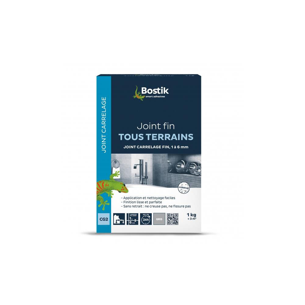 Le Joint Fin "Tous Terrains" de Bostik est un mortier de jointoiement polyvalent haute performance, conçu pour les travaux de finition en neuf comme en rénovation. | Doté de la technologie "Perl Effect", ce joint est hydrofugé dans la masse, ce qui le rend imperméable à l'eau et résistant aux salissures, garantissant une durabilité accrue dans les pièces humides comme les salles de bains ou les cuisines. | Sa granulométrie fine permet d'obtenir une finition très lisse et esthétique sans risquer de rayer les surfaces délicates comme la faïence ou le marbre. | Facile à préparer et à appliquer, il ne creuse pas et ne fissure pas au séchage (sans retrait), offrant un résultat professionnel pour des joints de 1 à 6 mm de large.
