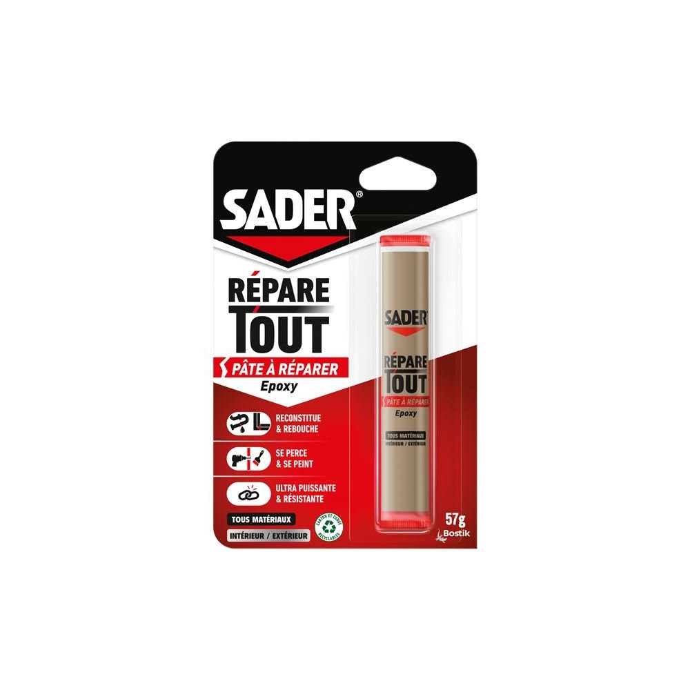 Que ce soit pour remettre en état un objet cassé, combler une cavité ou consolider un assemblage affaibli, cette pâte Sader est une référence dans sa catégorie. Retrouvez-la chez Brikoleur dans la gamme complète de colles et mastics de réparation, pour venir à bout de tous vos chantiers de bricolage.
