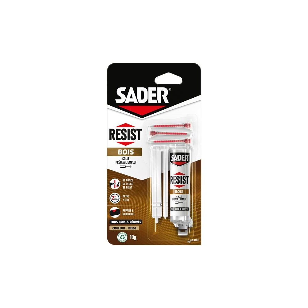 Réparer, assembler ou reconstituer du bois avec une résistance exceptionnelle : c'est la promesse de la colle Résist Bois Sader en seringue de 10 g. Basée sur la technologie bicomposant la plus avancée de la gamme Sader, cette colle structurale offre des performances de collage remarquables sur tous types de bois, qu'il s'agisse de bois massif, de contreplaqué, de MDF ou de bois exotiques.