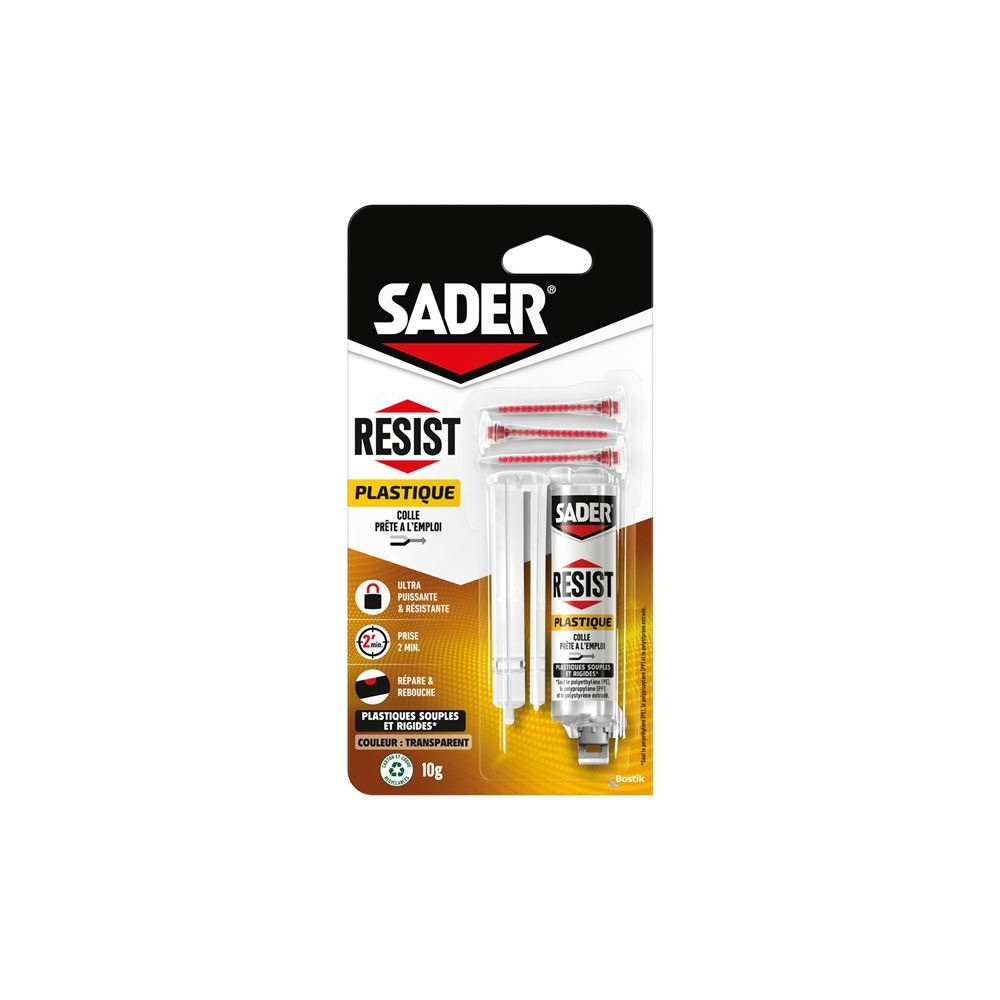 La Sader Résist Plastique en seringue 10g est une colle bicomposant de haute performance, spécialement formulée pour offrir des collages ultrarésistants sur tous types de plastiques. Sa formule avancée, parmi les plus abouties de sa gamme, lui permet non seulement de coller, mais aussi de réparer, reconstituer et reboucher les surfaces endommagées en une seule opération.