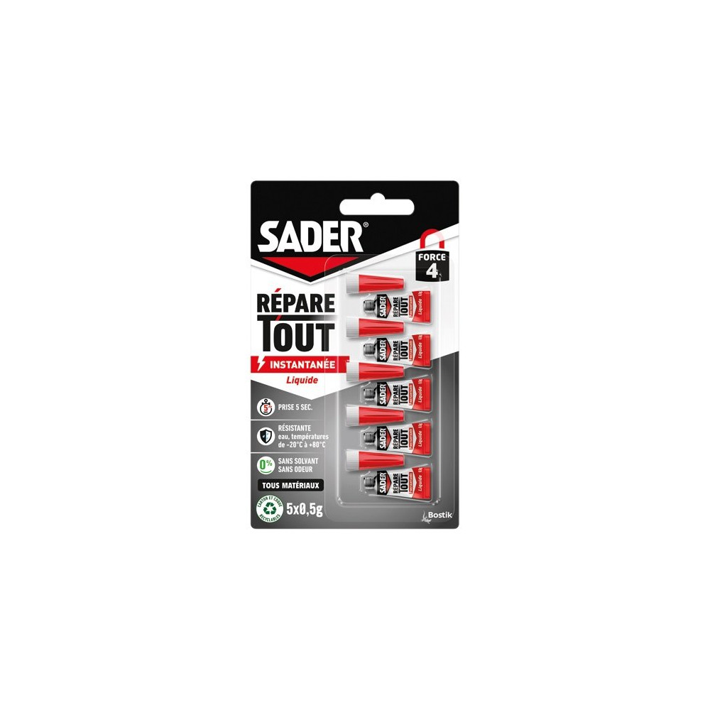 La colle SADER Fix & Glue liquide transparente en lot de 5 tubes de 0,5g chacun est une colle extra-forte de précision, basée sur la technologie MECA (cyanoacrylate de méthyle). Cette formulation de pointe offre une prise ultra-rapide et une résistance mécanique élevée sur une large variété de matériaux.