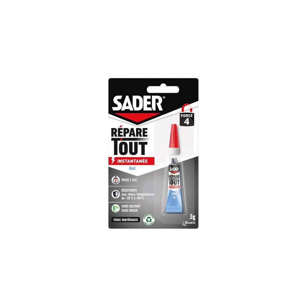 Disponible chez Brikoleur, la Fix Glue Gel 3g de SADER est l'alliée idéale pour maintenir vos objets du quotidien en parfait état. Pour un collage optimal, dégraissez et séchez les surfaces, appliquez une fine couche de gel puis maintenez les pièces en contact pendant quelques secondes. Un incontournable de la boîte à outils maison.