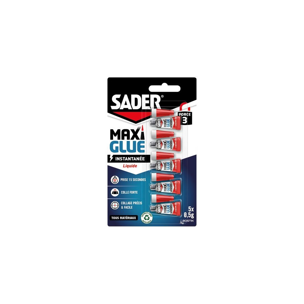 Disponible chez Brikoleur, ce lot de 5 dosettes Sader Maxi Glue 0,5g offre un excellent rapport praticité/prix. Conservez les dosettes non utilisées dans leur emballage d'origine, à l'abri de la chaleur et de l'humidité, pour des performances optimales lors de chaque utilisation.