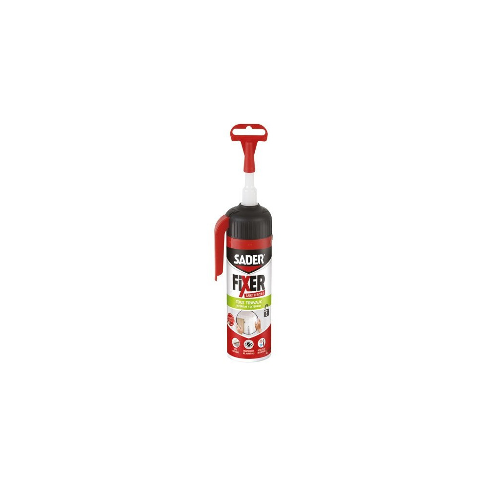 Alliant performance et respect de l'environnement, la colle SADER Fixer Sans Percer Tous Travaux en coloris transparent, format gâchette de 110 g, est une solution de fixation moderne et efficace pour tous vos chantiers intérieurs et extérieurs. Son système gâchette intégré permet une application directe, sans pistolet, avec une précision remarquable.