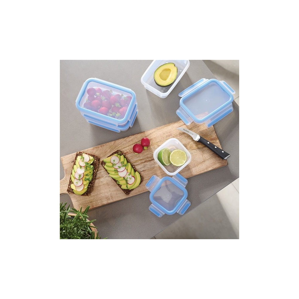 La conception hermétique Masterseal Fresh repose sur un couvercle verrouillé par quatre clips latéraux qui garantissent une étanchéité totale. Aucun risque de fuite lors du transport dans un sac ou de basculement dans le réfrigérateur. Le plastique utilisé est sans BPA et résiste à la congélation comme aux cycles répétés en lave-vaisselle.
