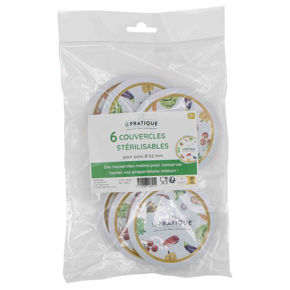 Prolonger la vie de vos bocaux de conservation n'a jamais été aussi simple avec les 6 couvercles stérilisables Le Pratique Ø82 mm. Conçus pour remplacer facilement des couvercles usés ou perdus, ils s'adaptent à tous les bocaux d'un diamètre de col de 82 mm, quelle que soit la marque, offrant ainsi une solution économique et pratique pour continuer à utiliser vos bocaux existants.