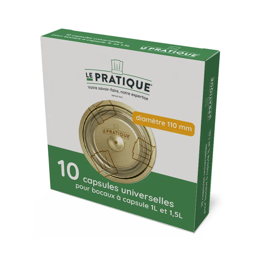 Conçues pour les grands formats de bocaux, les 10 capsules universelles Le Pratique Ø110 mm sont spécifiquement adaptées aux bocaux de 1 litre et 1,5 litre dotés d'un col de 110 mm de diamètre. Un lot indispensable pour ceux qui font leurs conserves en grandes quantités et souhaitent disposer d'une réserve de capsules fiables à portée de main.